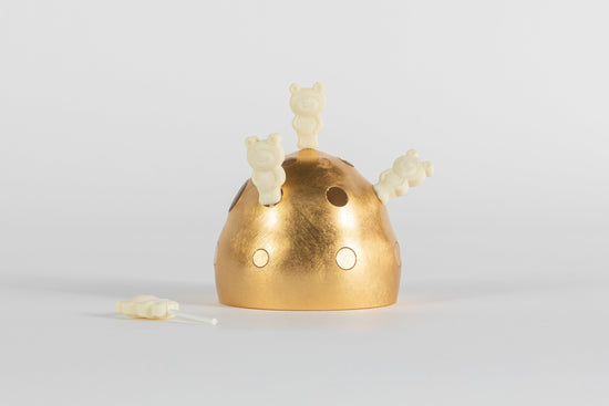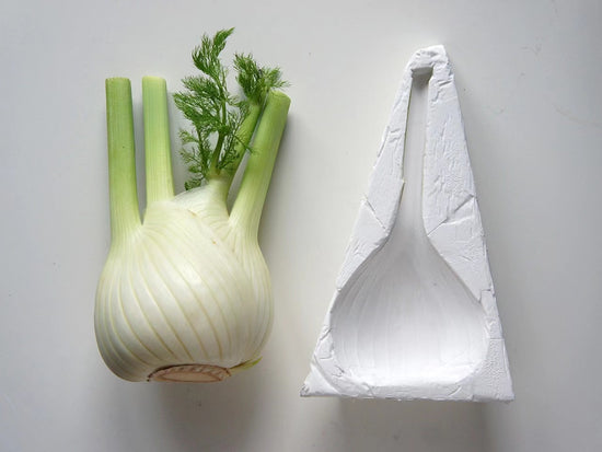 MoreEngraft 系列源自設計師 Qiyun Deng 於 2013 年的畢業作品,始於一個決定,以植物表皮作為觸感的媒介。她挑選具有獨特質地的蔬果,將其表面細節精確複製,以樹脂重現並與 3D 列印的人工部件結合。這些異質結構在自然與人造之間產生微妙張力。作品中的漸層色源自雙色射出成型工法,在模具兩端同時注入不同顏色的樹脂,使物件在結構之外,也呈現時間流動般的層次與深度。