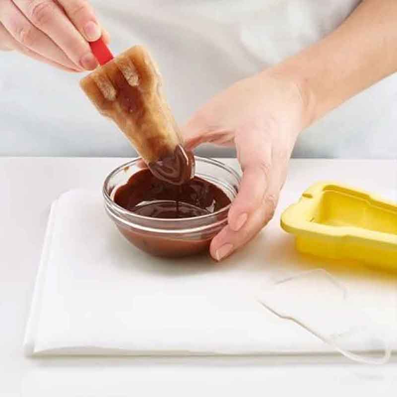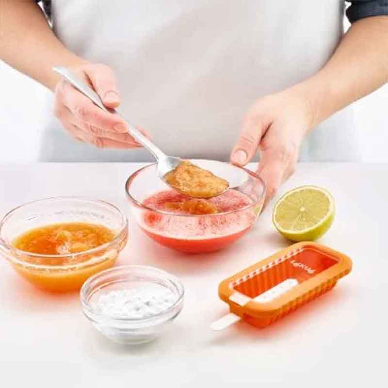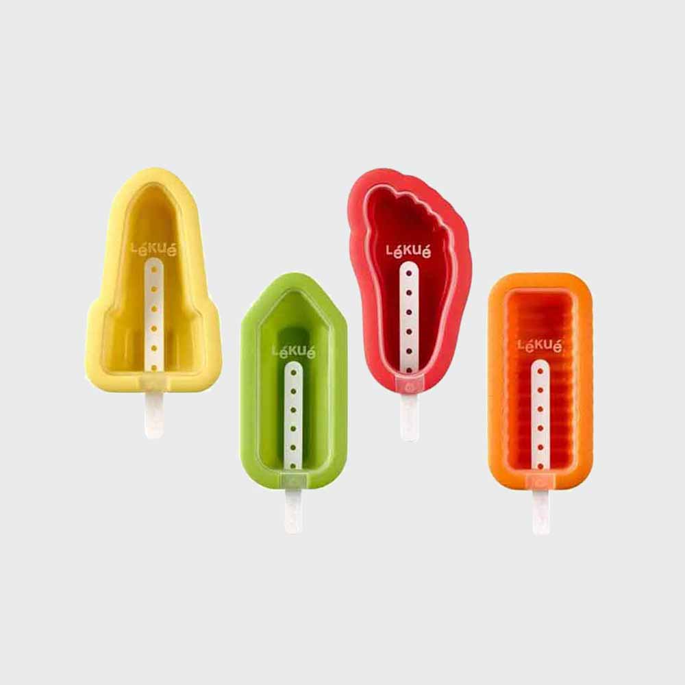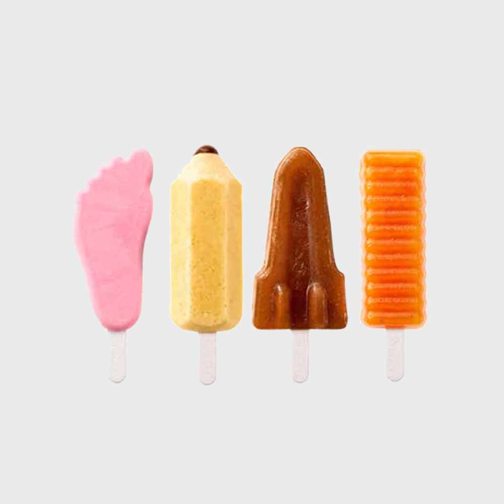本商品一組 4 件 (附蓋,型狀有腳ㄚ、鉛筆、條紋、火箭)、冰棒棍 x 4,容量 55 ml (約 2 fl oz.)、耐熱度 -20~100 度C,適用冷凍與洗碗機;全系列由高密度且品質穩定的白金矽膠製成 (BPA Free);請勿在白金矽膠上使用尖銳器具,如刀叉、鋼刷等;使用前可參閱內附原廠食譜。喜歡自製安全衛生的冰品,給家中大人小孩一起消暑享用的您,此組冰棒模不容錯過。無論是草莓、優格燕麥口味,或是多層次口感的爆米花焦糖冰棒,發揮創意讓冰品吃得更健康有趣。首先將冰棒棍插入模具一側小孔 (長度至劃線處),將攪打好的餡料、果汁倒入矽膠模具內 (建議盛裝 8~9 分滿即可),蓋上透明塑膠蓋、放入冰箱冷凍庫 4~5 小時,等待冰品結凍即可享用;好脫模的矽膠材質,只需稍微彎折便可取出冰棒 (連同冰棒棍一起取出);附蓋平放不易翻倒溢出,清洗容易且可重複使用更環保。