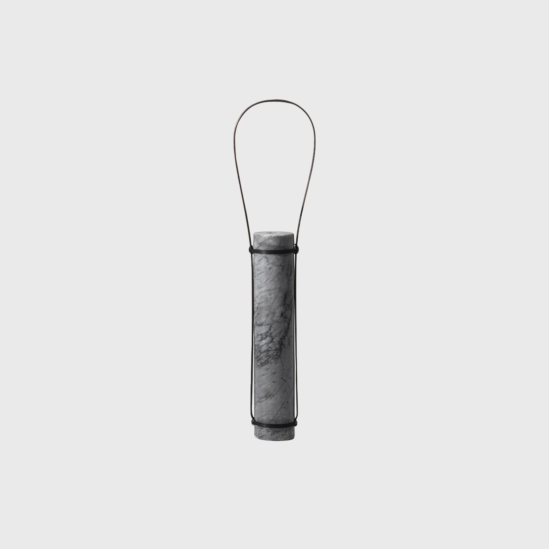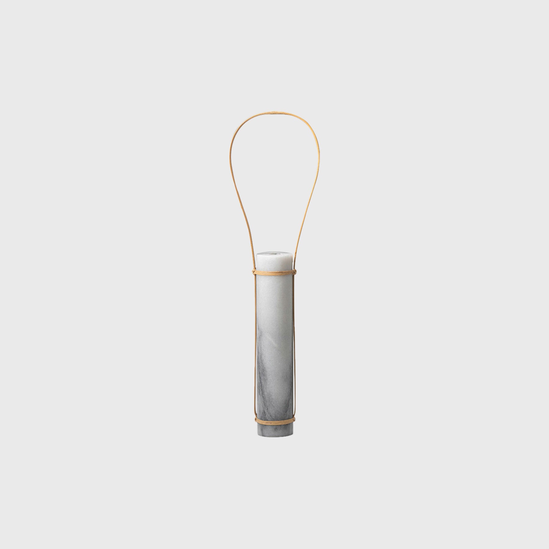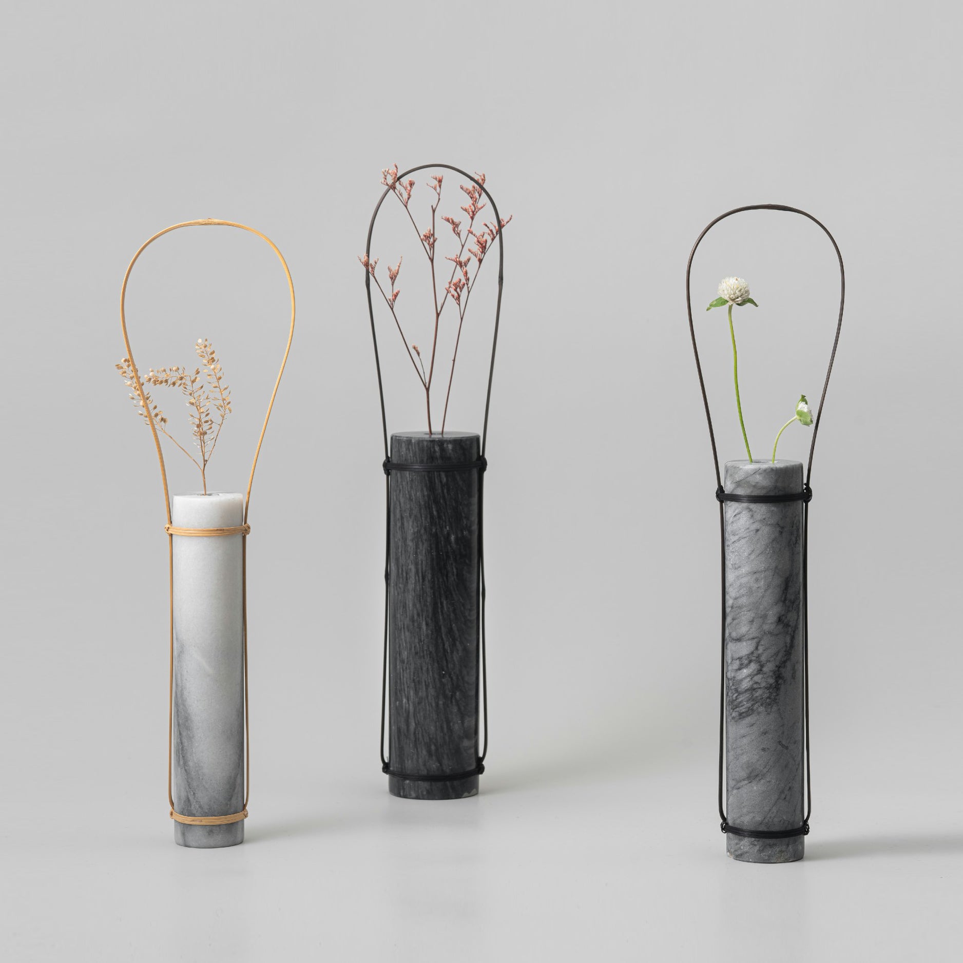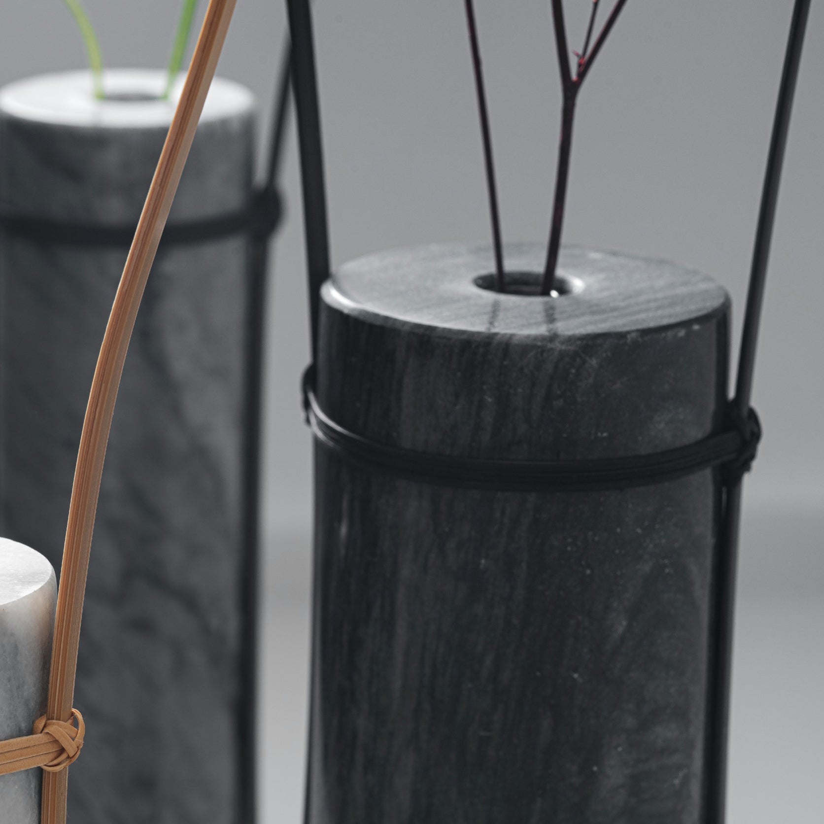 承襲經典竹花器,異材質的結合大理石與竹、藤材質。 石的冷冽獨特紋理與竹藤的溫潤曲線相稱互補, 為經典花器再創一番新的樣貌。 石為實,竹為線;具重量感的石柱為基座,彎曲的竹線條亦為瓶上花朵的空間層次石與竹之間再由細緻的藤編,穿繞編織結合而成。 展現各材質的本質與融洽的異材質共融設計。