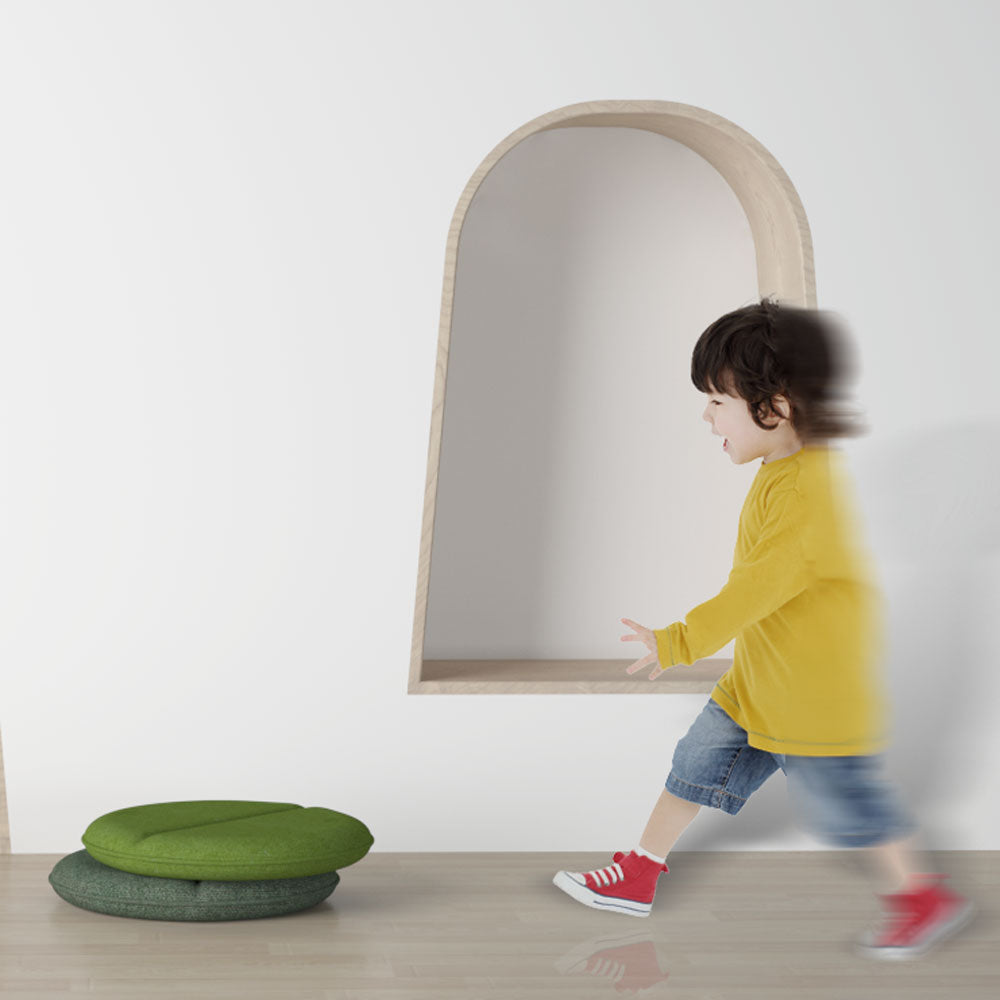 盛夏時期,牆角一片鬱鬱蔥蔥的豌豆給了設計師靈感,豆莢裡圓鼓鼓的果實,充滿活潑的朝氣。把豌豆坐墊放置在台階上、地面上,深深淺淺的綠彷彿讓人置身富有生機的大自然。豌豆坐墊取豌豆圓潤的造型,坐墊中間向內凹陷的造型線與豌豆莢相迎合,在面料上選擇了三款綠色系三防面料,內部填充4cm厚的聚氨酯泡棉,保證豌豆坐墊的造型感和舒適的坐感。