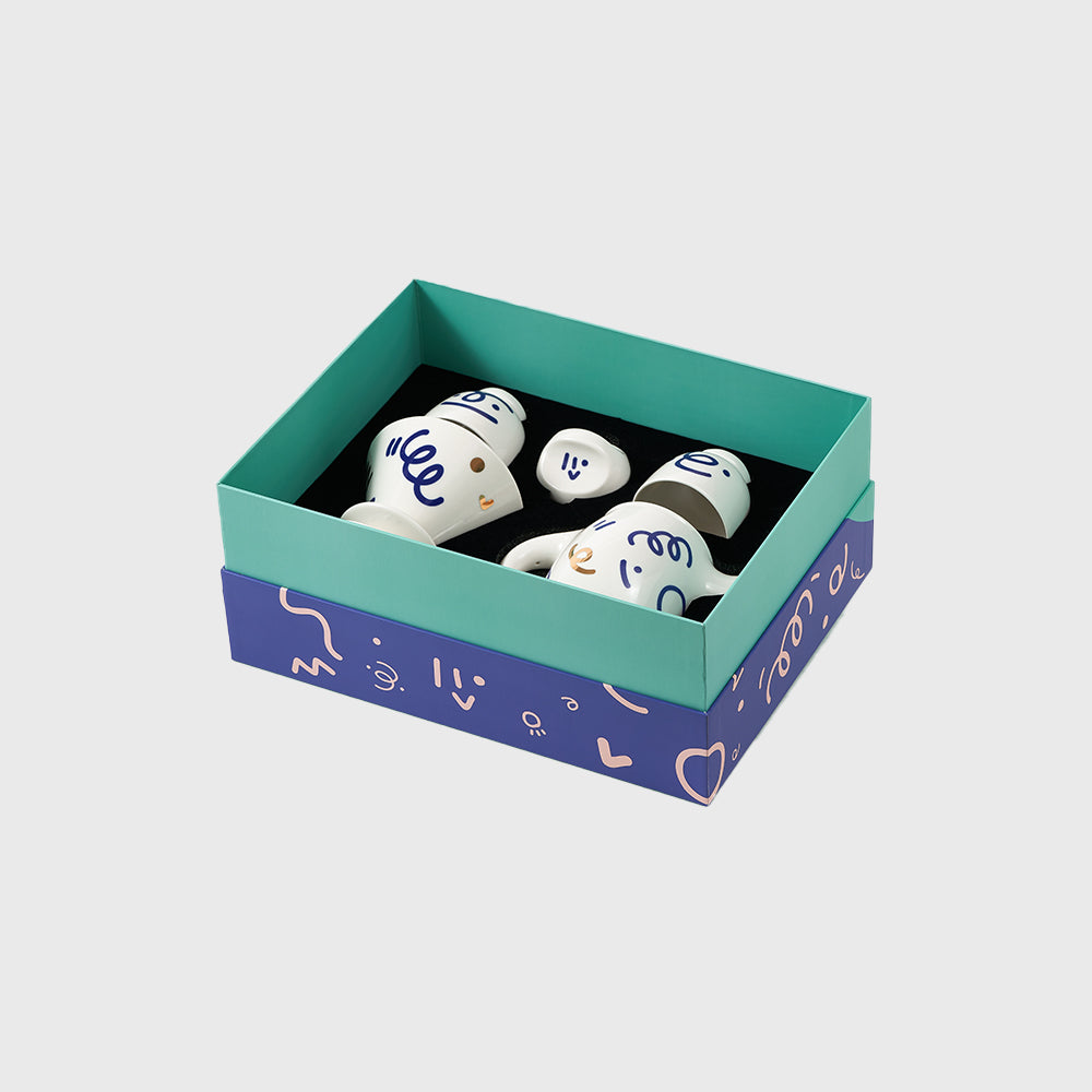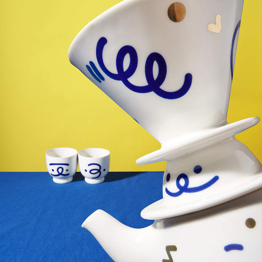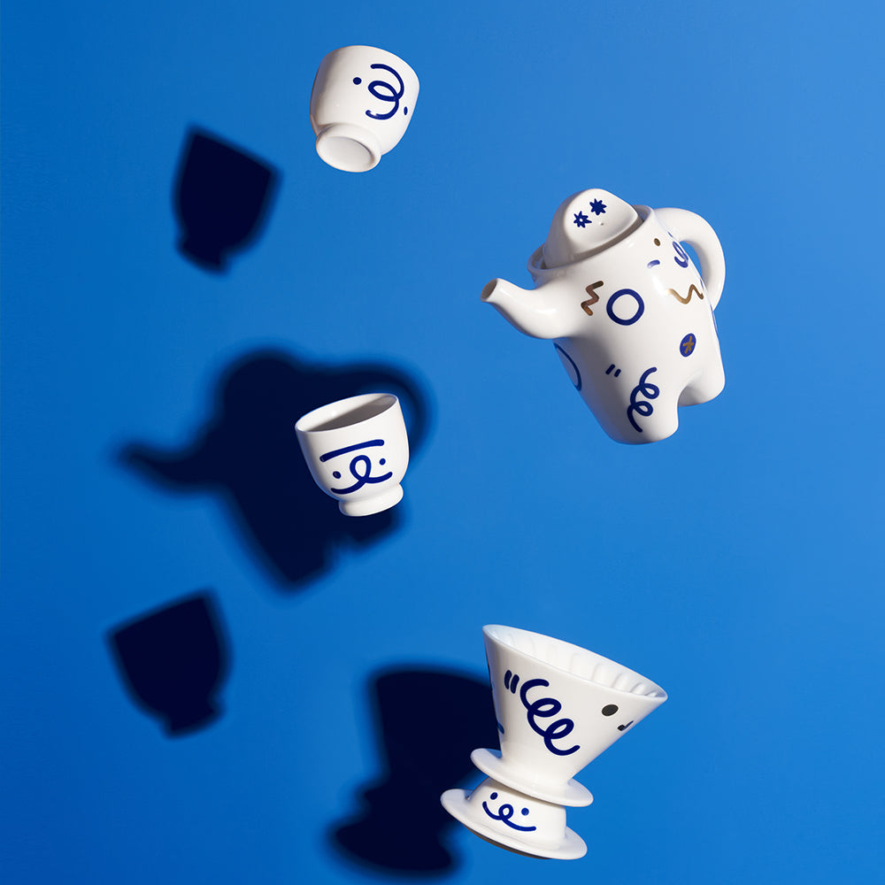 高溫白瓷、釉中藍色花紙+釉上真金花紙、不銹鋼茶漏