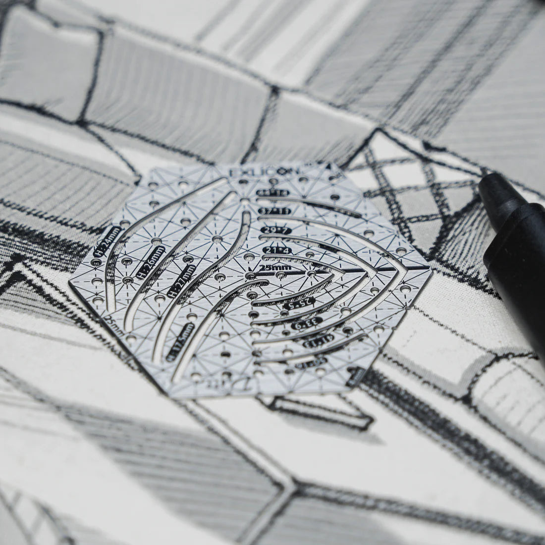 這款尺設計為模板與測量工具,可用來繪製對稱的弧形圖案。使用時可沿著線條描繪,並翻轉工具來創造各種弧線,特別適合建築設計使用。除此之外,這款尺也能透過對齊孔位與對應線條來繪製六邊形、三角形、正方形與長方形等形狀。此外,這些孔洞還可透過轉動尺盤的方式繪製出不同大小的圓形,一支筆固定,另一支筆轉動,即可完成。