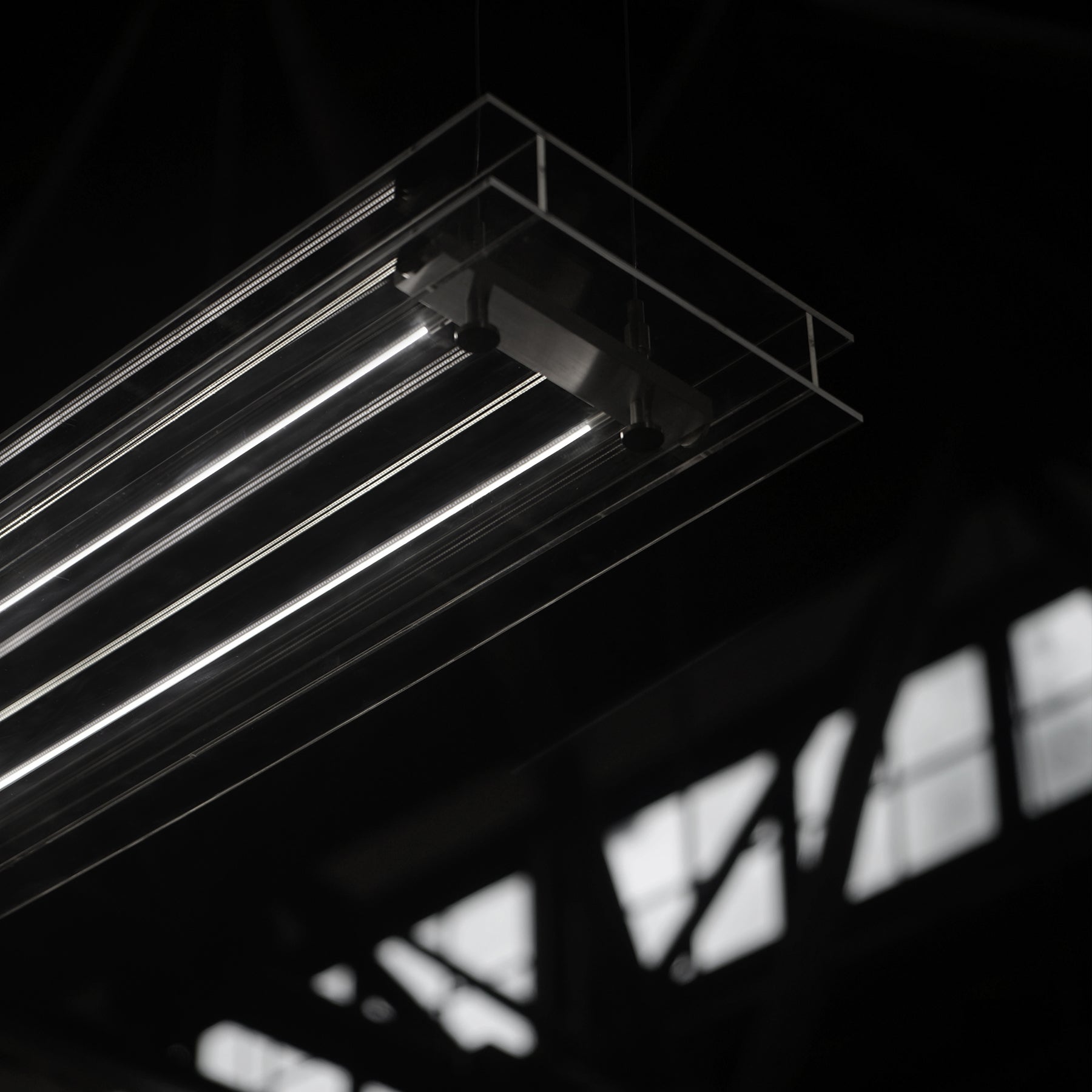 由金屬框架支撐的LED燈帶投射出的筆直光線,與外層的玻璃面板帶來不同的反射,空間裡的光讓它發生反應,而它同時也在微妙地改變著光線。整個燈具隨著不同的觀看角度產生無限的光影體驗。這也是電燈的設計緣由,它挑戰傳統燈具的照明目的並提出一種新的構想,即燈具本身的作用能否是創造一個特殊的體驗,用於提升空間的質感。 LED 燈帶的亮度可以通過遙控器遠程控制以適應不同的空間氛圍需求。