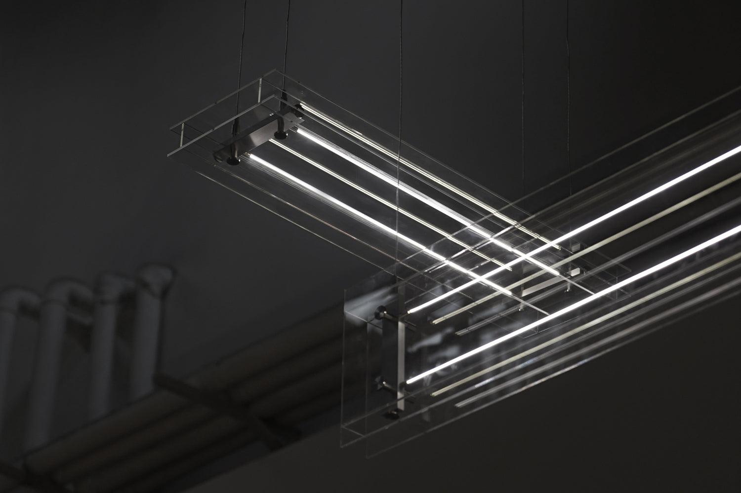 該系列以玻璃面板,金屬框架及 LED 燈帶構成了一個功能件全部外露的燈具,如同一個微型高技派建築。燈具點亮時,如同電流擊穿空氣。