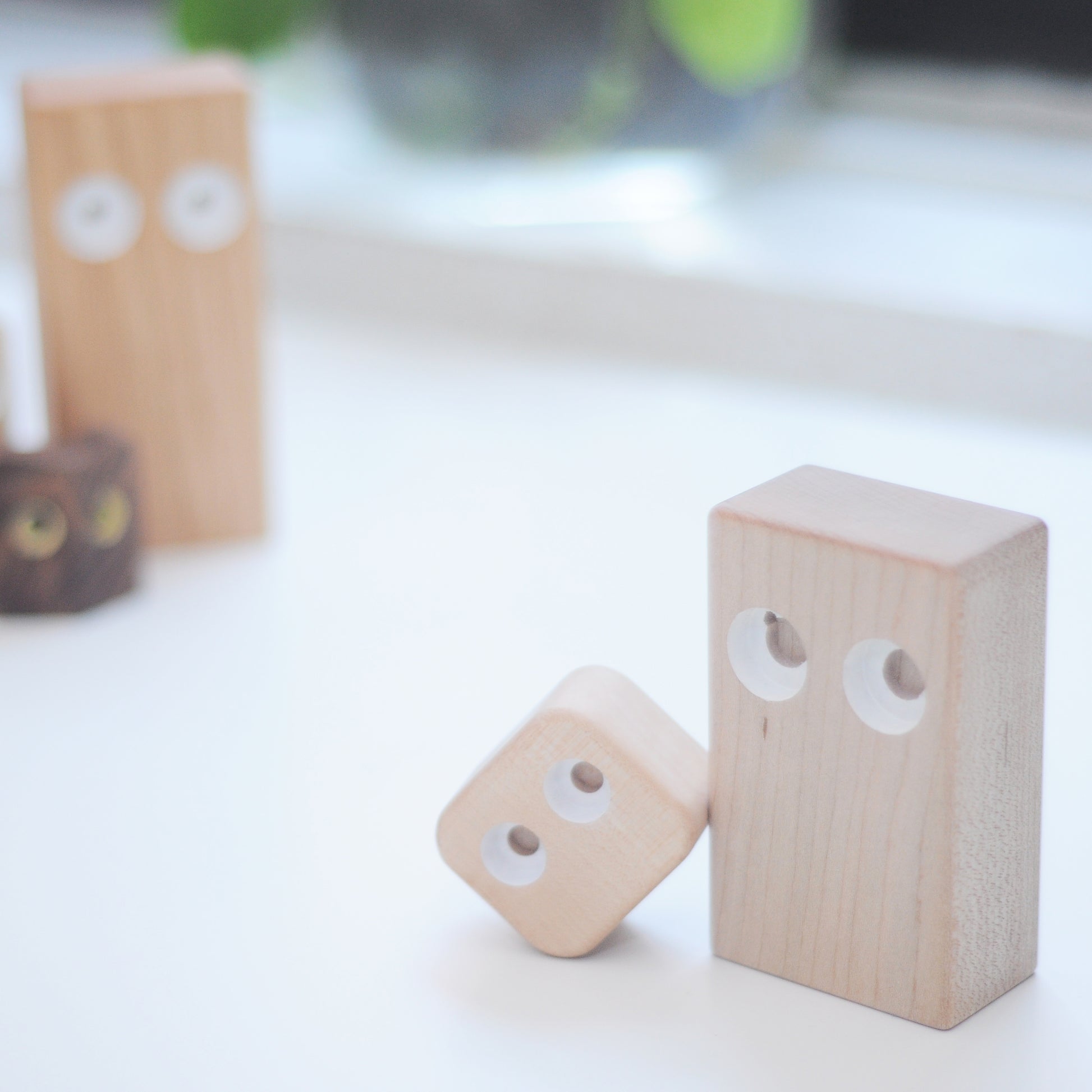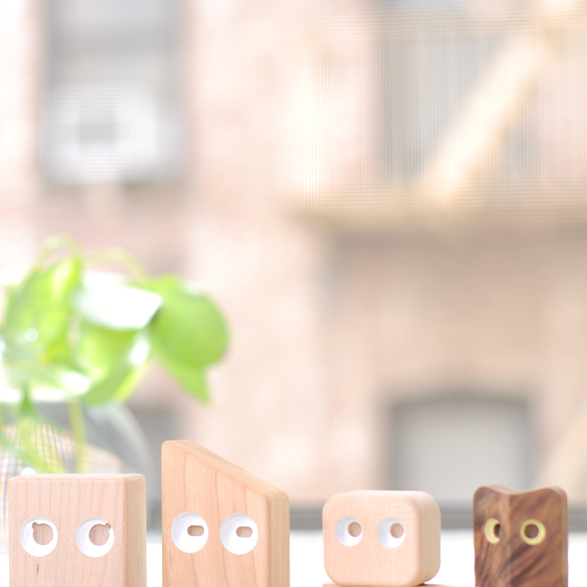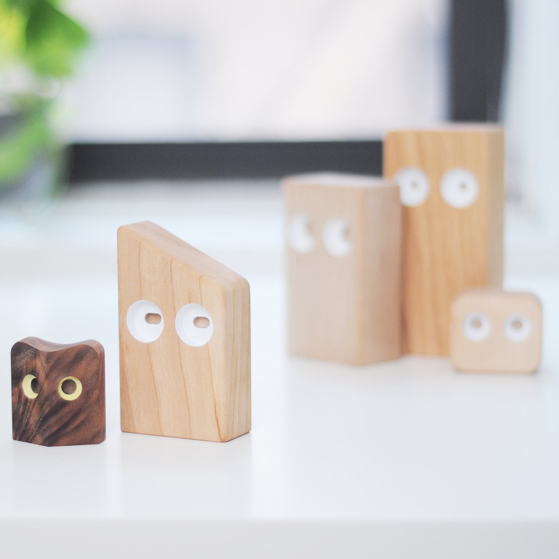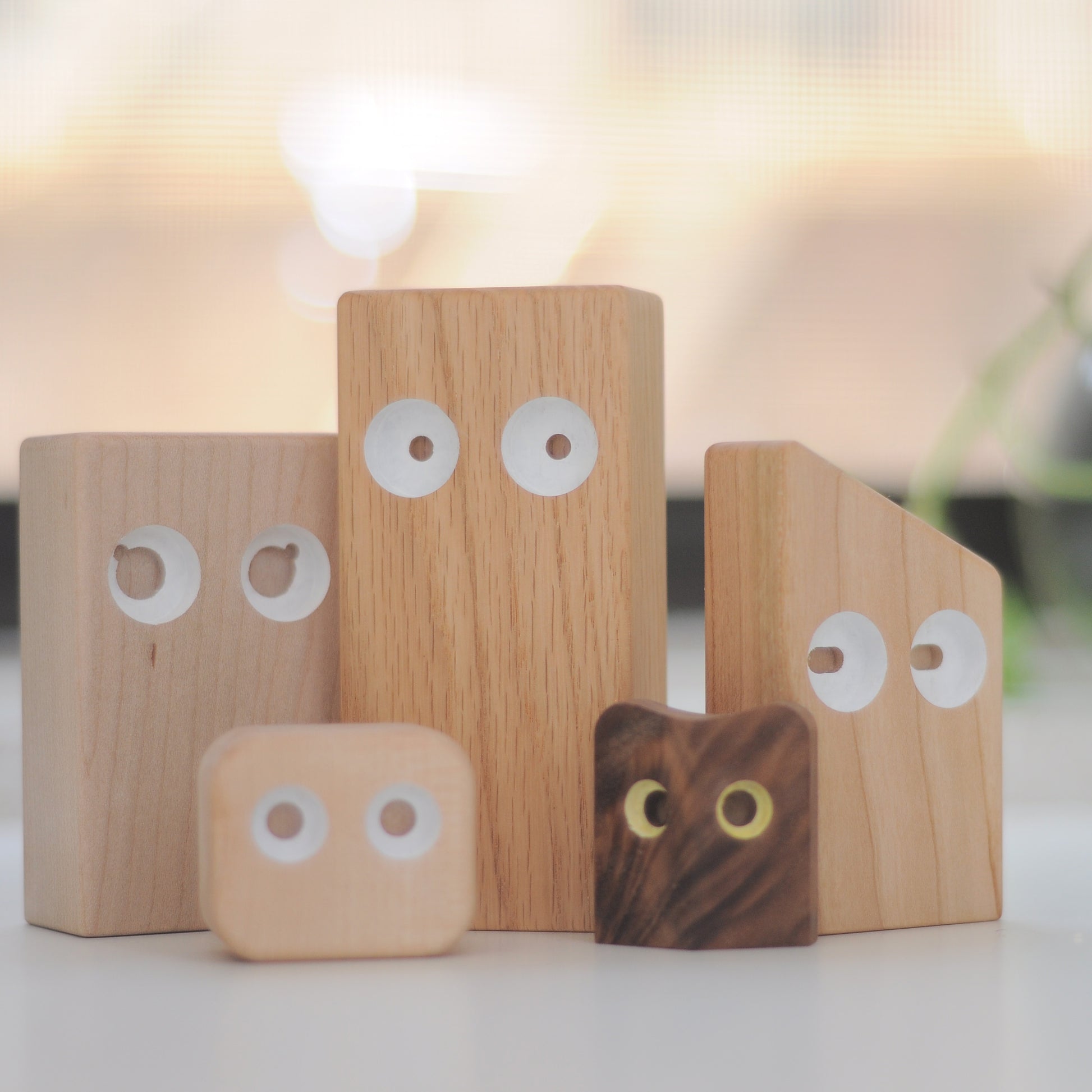 這一套木質手工玩具,五個小玩偶采用了最簡潔的設計,透過不同的木質紋理顏色,以及木眼睛的特征賦予各自不同的性格,特點。靈感來源於設計師在一次制作木家具榫接的過程中偶然發現了一個簡單的景深透視的小原理,所鉆的孔洞從不同角度觀看像是會轉動的眼睛,從而借此來設計並制作了這套各個角色都擁有一雙會時時“跟隨”你的大眼睛的木眼玩具。