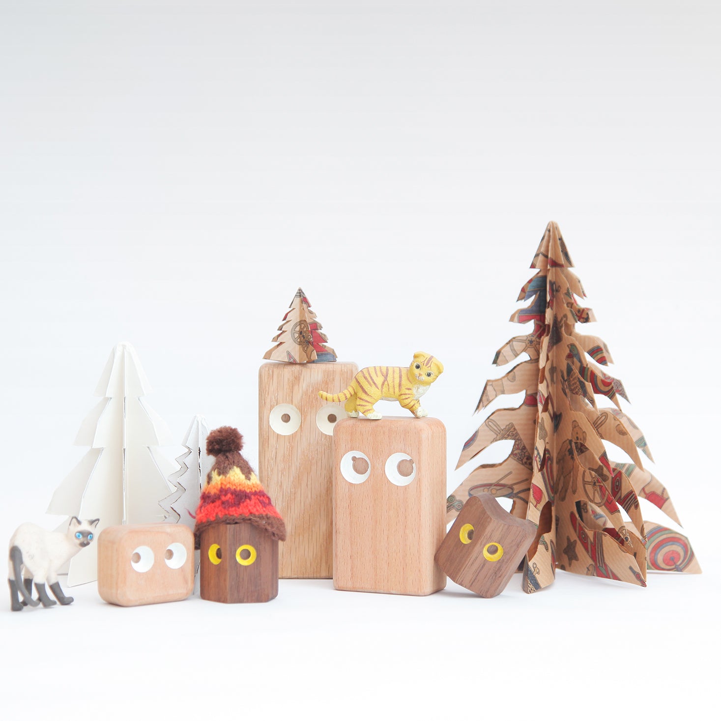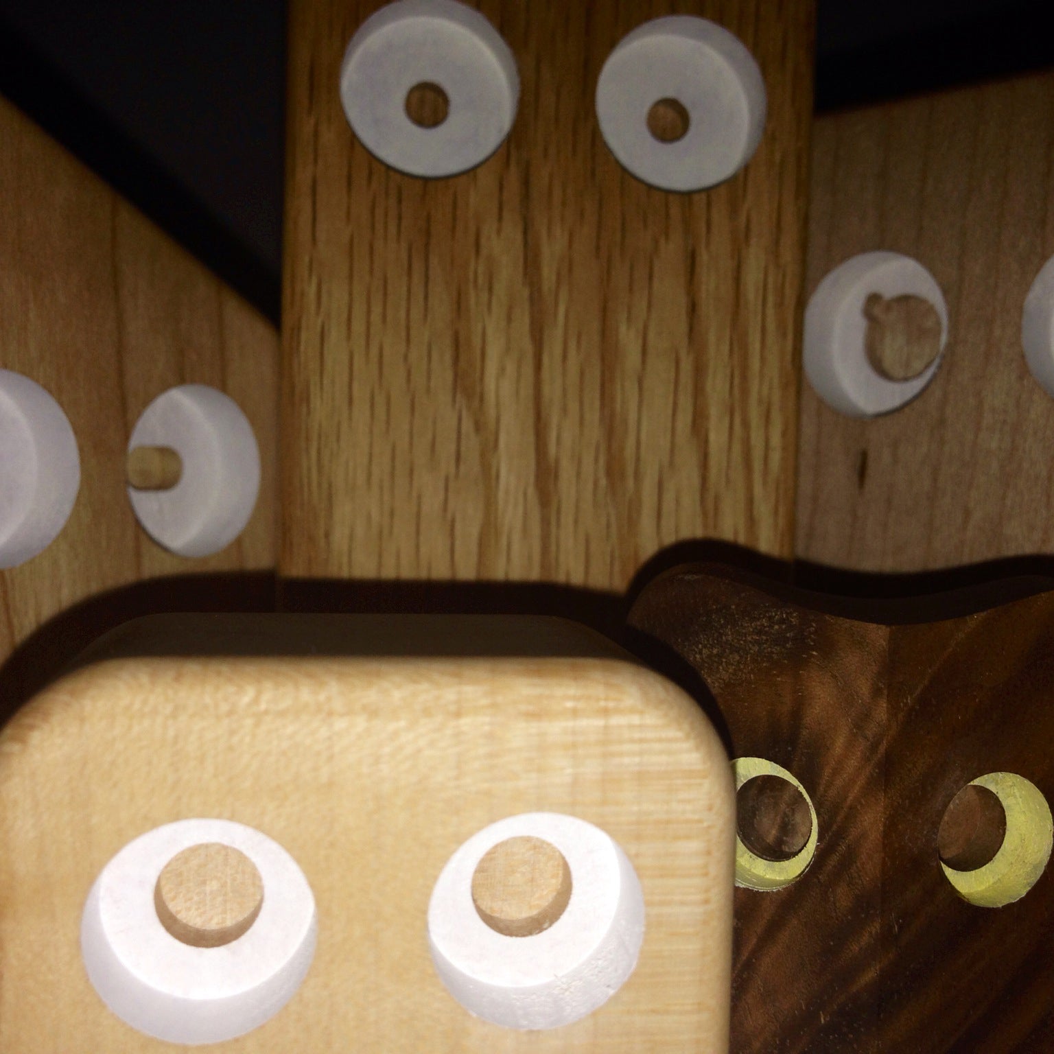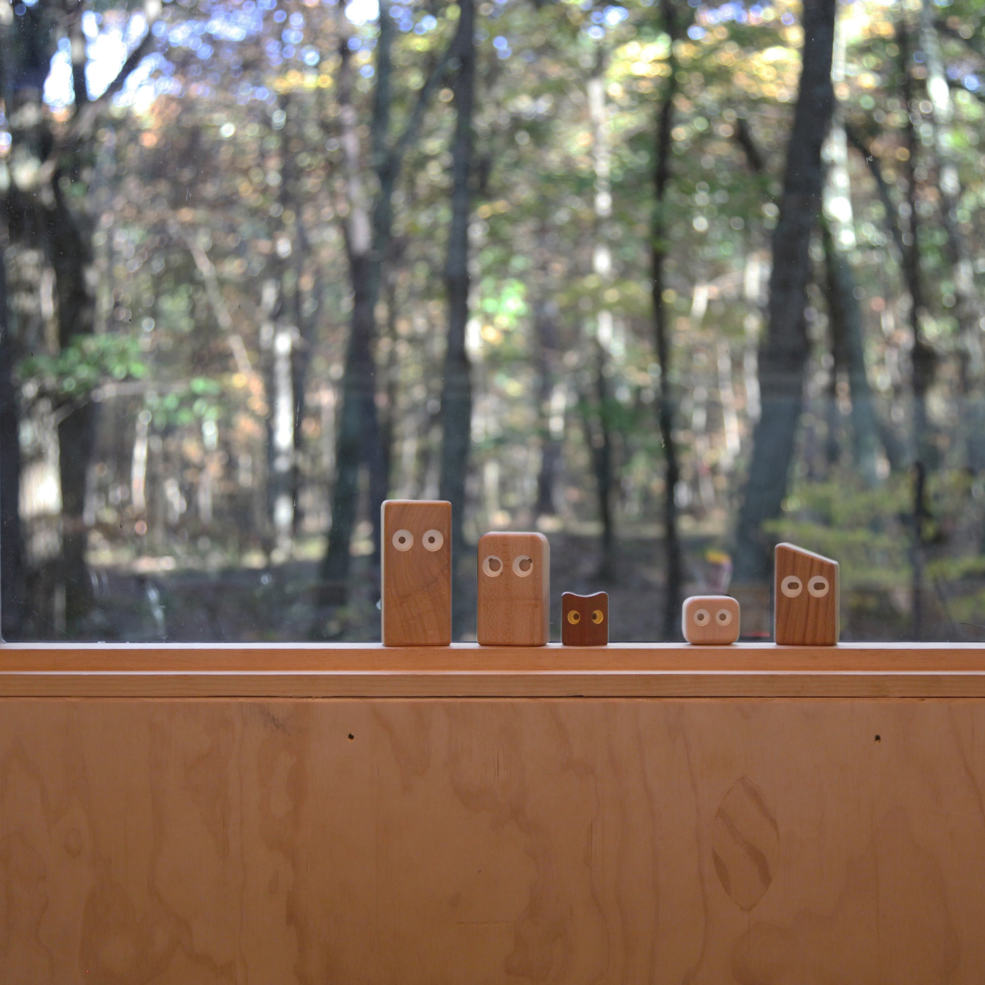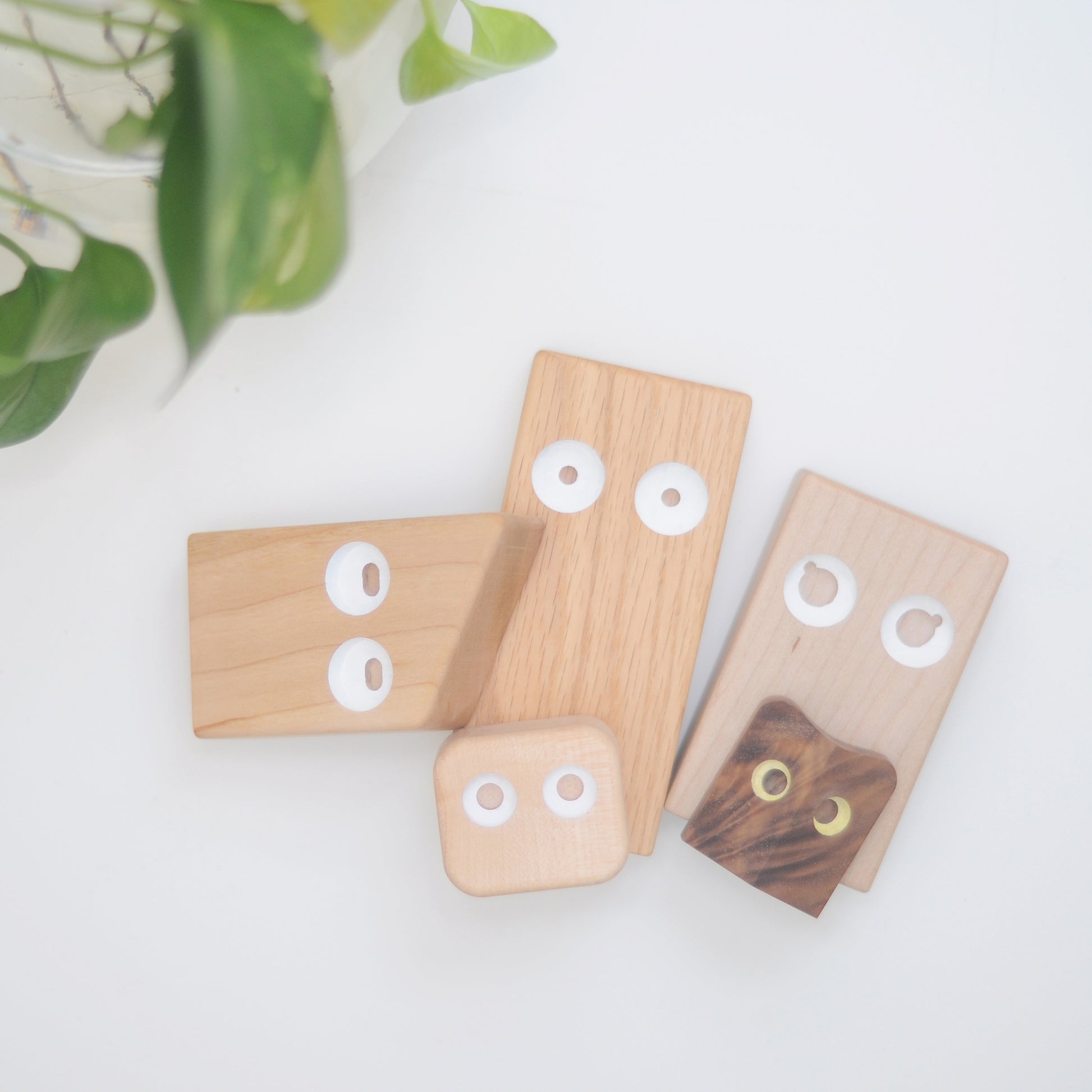 這一套木質手工玩具,五個小玩偶采用了最簡潔的設計,透過不同的木質紋理顏色,以及木眼睛的特征賦予各自不同的性格,特點。靈感來源於設計師在一次制作木家具榫接的過程中偶然發現了一個簡單的景深透視的小原理,所鉆的孔洞從不同角度觀看像是會轉動的眼睛,從而借此來設計並制作了這套各個角色都擁有一雙會時時“跟隨”你的大眼睛的木眼玩具。