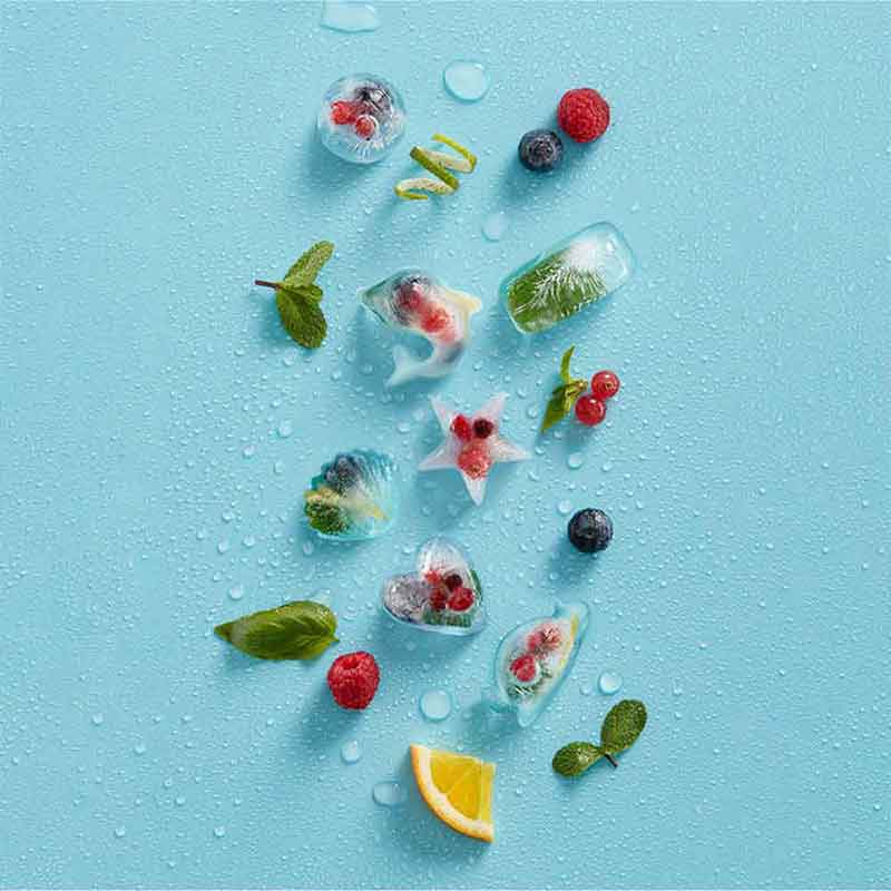 ※ 製冰時可適量加入香草葉、藍莓等香料果粒,讓透亮的冰塊變得繽紛且口感豐富。