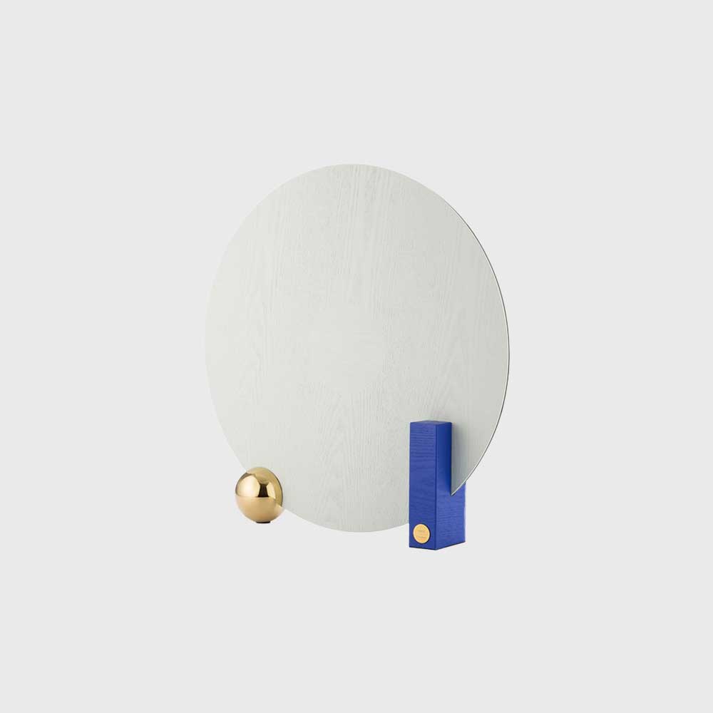 長方形底座為翡翠色大理石,或木色/著色水曲柳噴漆飾面的金屬材質;球型底座為黃色鈦金鏡面,不鏽鋼材質;鏡子背面為青瓷綠水曲柳飾面,一面明鏡。