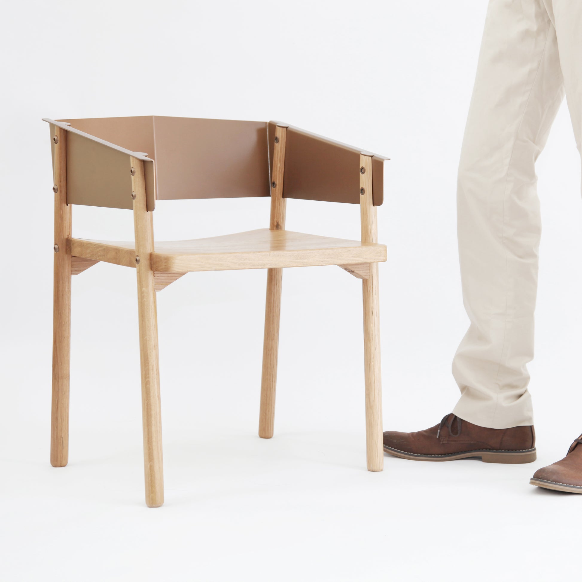 The aesthetics of Note Chair & Table is to maximize and integrate forms with distinctive materials. The minimal white oak legs interlock with the folded-cutout-sheet-metal arms/seatback visually and structurally. The out-folded semicircles of the arm rests cap the end grain of the wooden legs, which is the most rough and dark notion, and structurally convey weight to the ground efficiently. All components are durable and easy to assemble. Metal arms/seatback is available in different colors and finishing and can be customized.