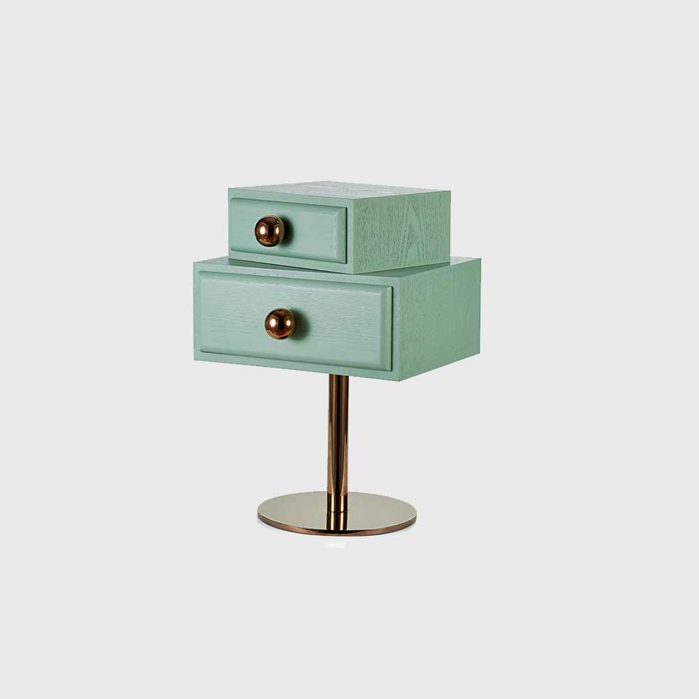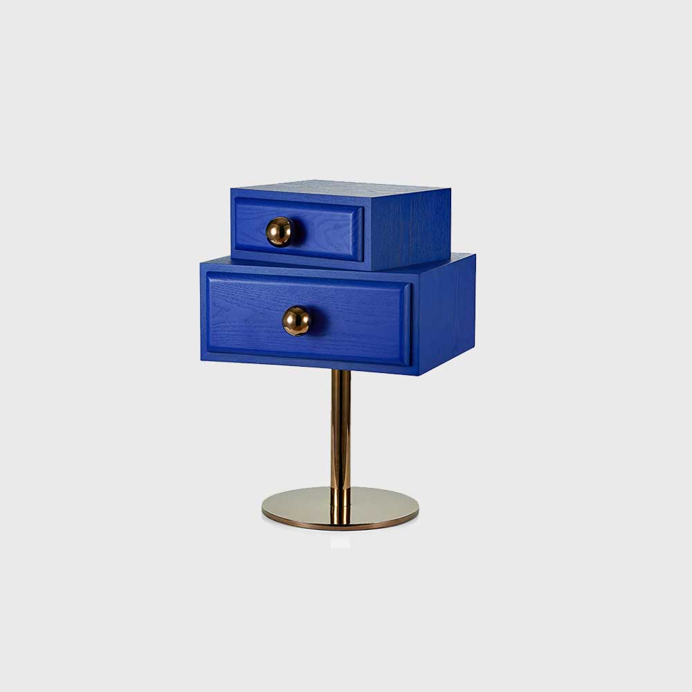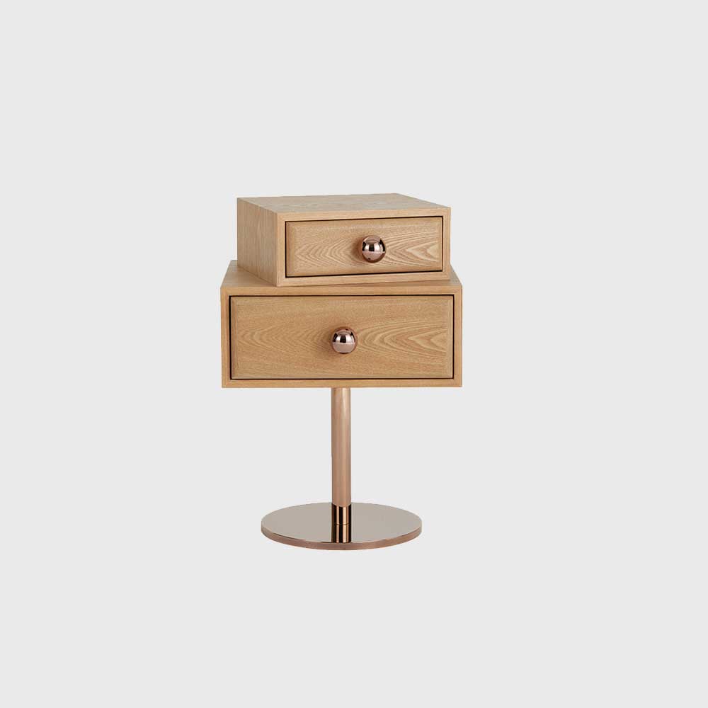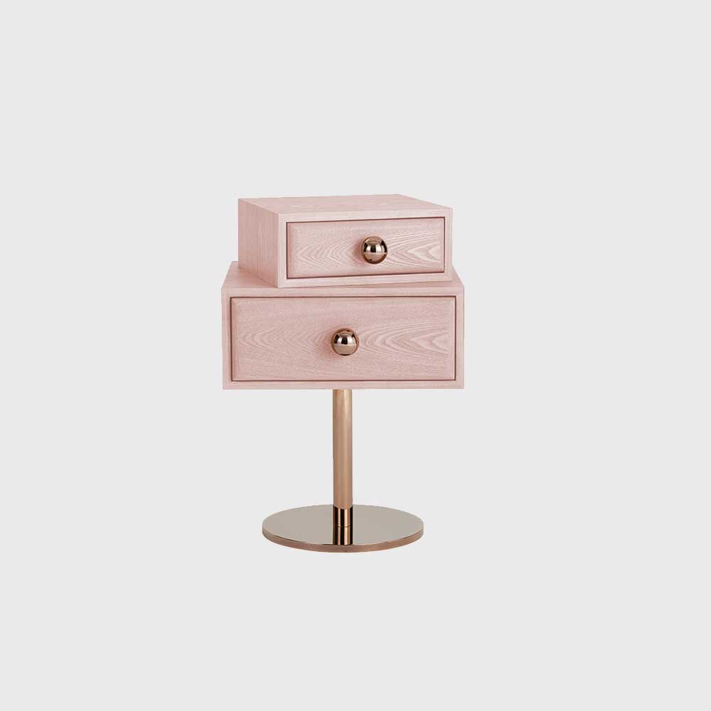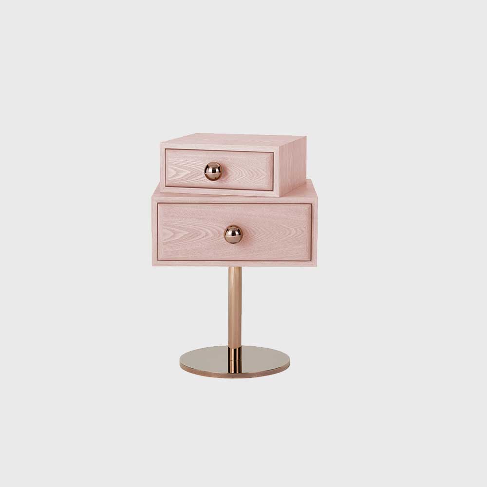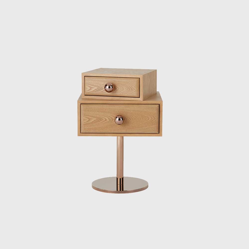 此款床頭櫃延伸自英文Night Stand,在夜幕降臨時,在床邊伴隨著某人,緩緩進入夢鄉。作品取名採用了Ben E. King耳熟能詳的經典曲目Stand by me,輕快的旋律隨即響起。而Stand by me憑其獨特的外型也能作為單品,在不同風格的空間中使用。兩個並列而交錯的抽屜堆疊著,展現了動感以及別出新意的幾何造型。圓形的玫瑰金底座支撐整個櫃體,賦予結構的穩固性。