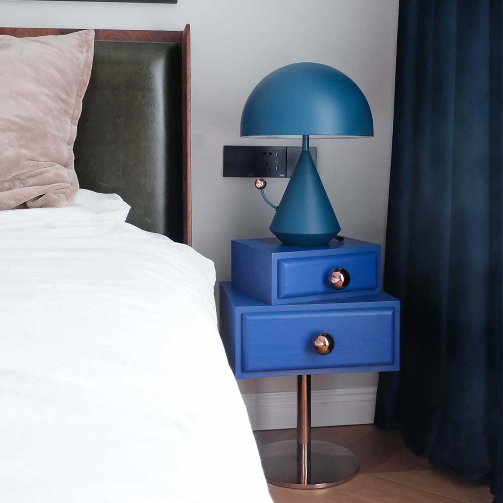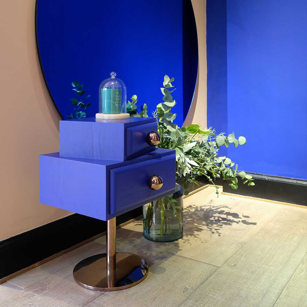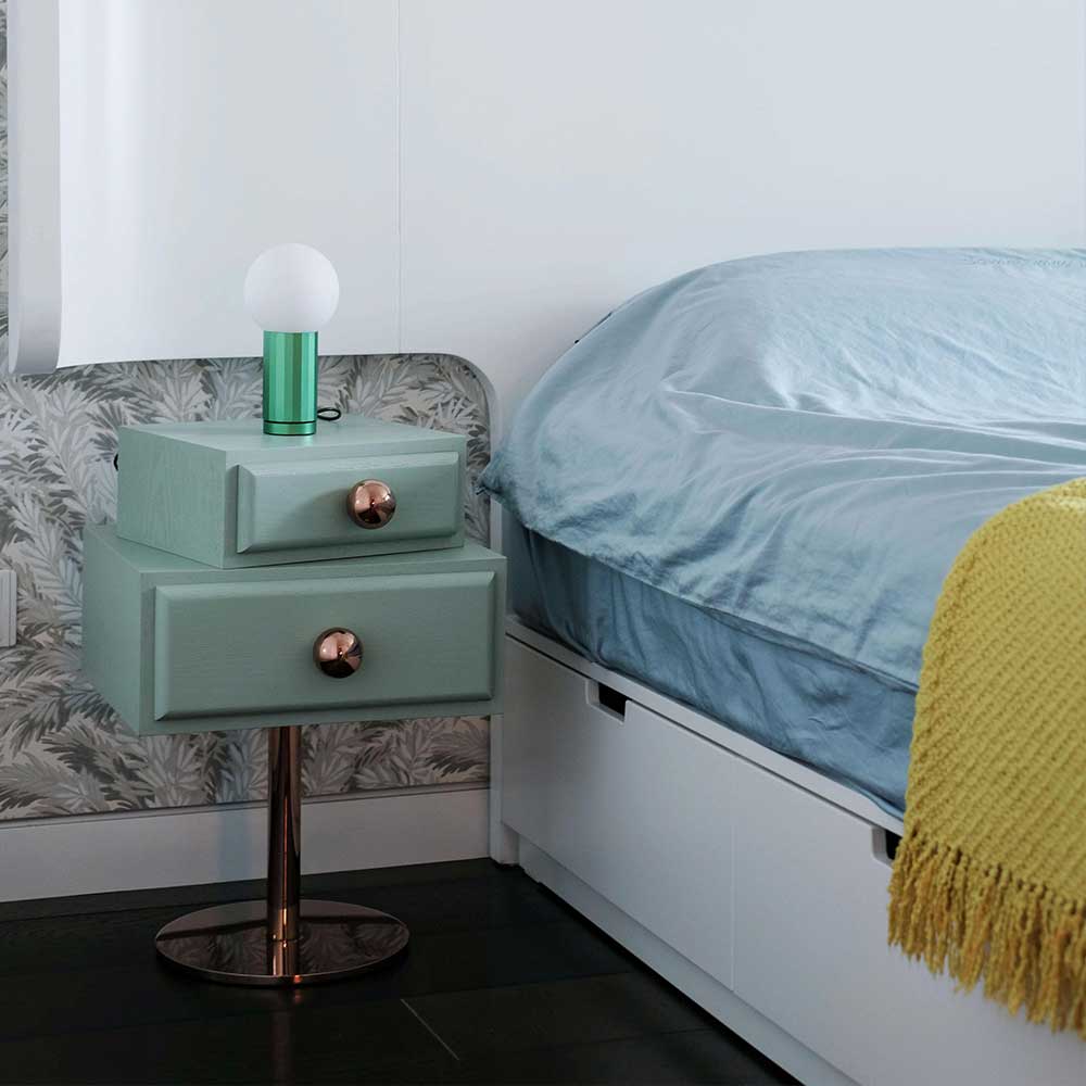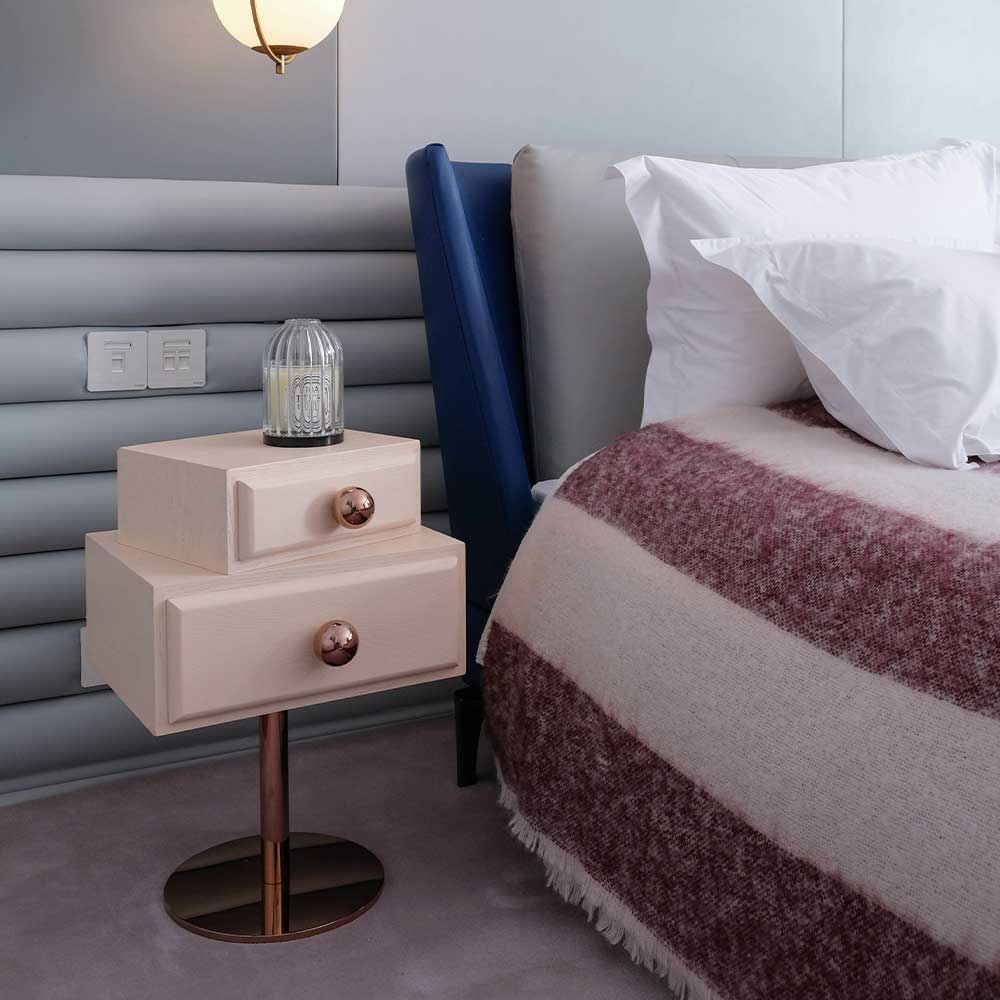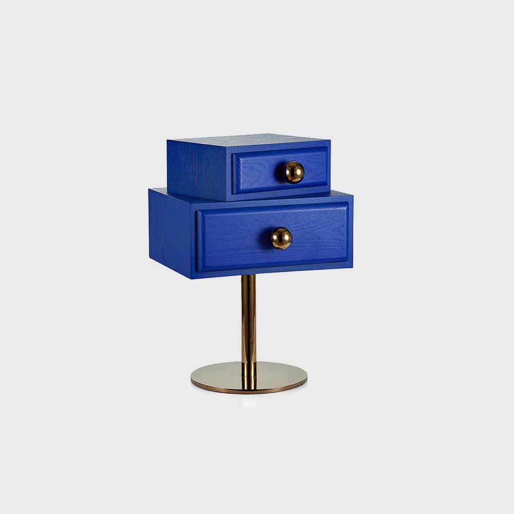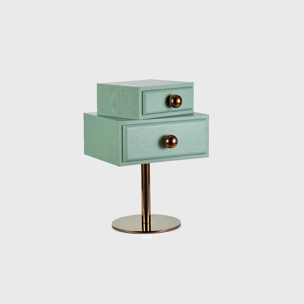 此款床頭櫃延伸自英文Night Stand,在夜幕降臨時,在床邊伴隨著某人,緩緩進入夢鄉。作品取名採用了Ben E. King耳熟能詳的經典曲目Stand by me,輕快的旋律隨即響起。而Stand by me憑其獨特的外型也能作為單品,在不同風格的空間中使用。兩個並列而交錯的抽屜堆疊著,展現了動感以及別出新意的幾何造型。圓形的玫瑰金底座支撐整個櫃體,賦予結構的穩固性。