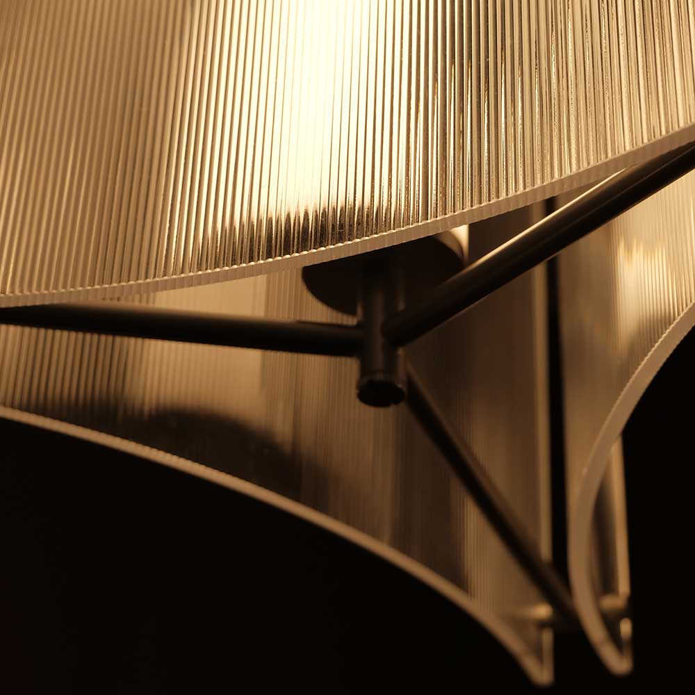 樹脂玻璃不僅比玻璃具有更好的透光率而且不會像玻璃一樣易碎,僅用幾顆螺絲,便可與框架連接通過對傳統燈籠形態的解構,再重組瓦片之間的縫隙也會讓燈體在視覺上減輕體量感的同時更加靈動。